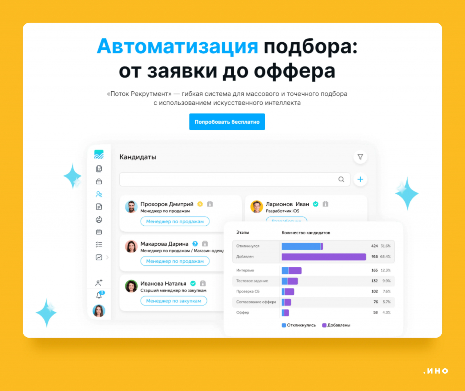 Позволяет автоматизировать процесс поиска кандидатов, публикацию вакансий, сбор резюме, проведение первичных собеседований и даже тестирование. В результате сокращается время заполнения вакантных позиций и повышается качество отбора.