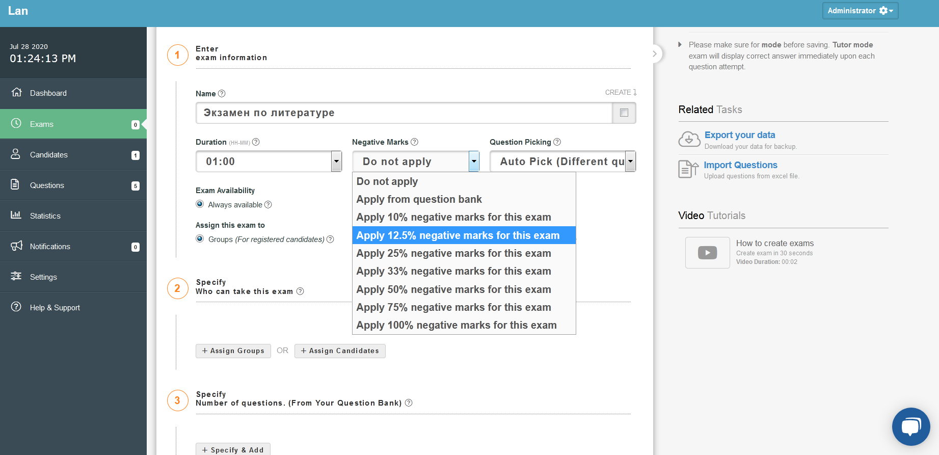- Многообразие типов заданий: Вопросы с выбором ответа, с открытым ответом, на установление соответствий и многое другое.